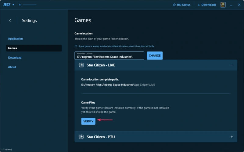 点击齿轮图标,进入 SETTINGS (设置),点击对应版本的 Verify (验证) 按钮,进行验证。